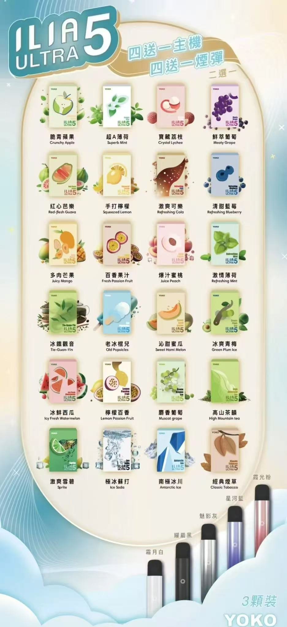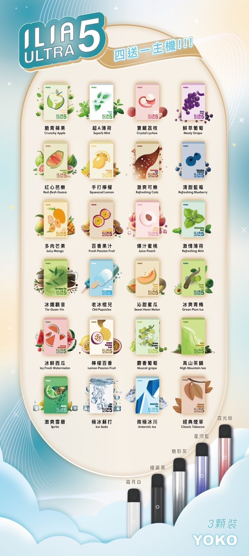 脆青蘋果, 超A薄荷, 寶藏荔枝, 鮮萃葡萄, 紅心芭樂, 手打檸檬, 激爽可樂, 清甜藍莓, 多肉芒果, 百香果汁, 爆汁蜜桃, 激情薄荷, 冰鐵觀音, 老冰棍兒, 沁甜蜜瓜, 冰爽青梅, 冰鮮西瓜, 檸檬百香, 麝香葡萄, 高山茶韻, 激爽雪碧, 極冰蘇打, 南極冰川, 經典煙草